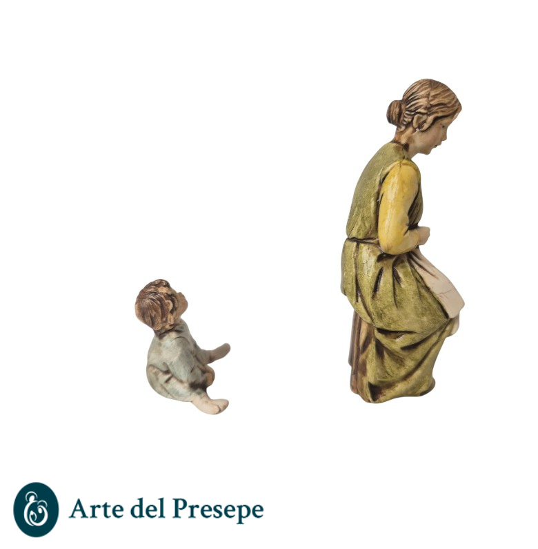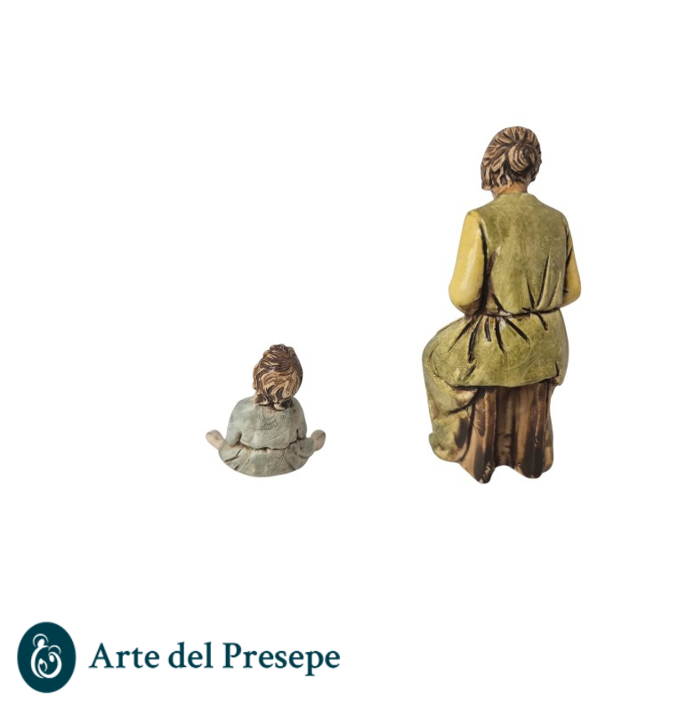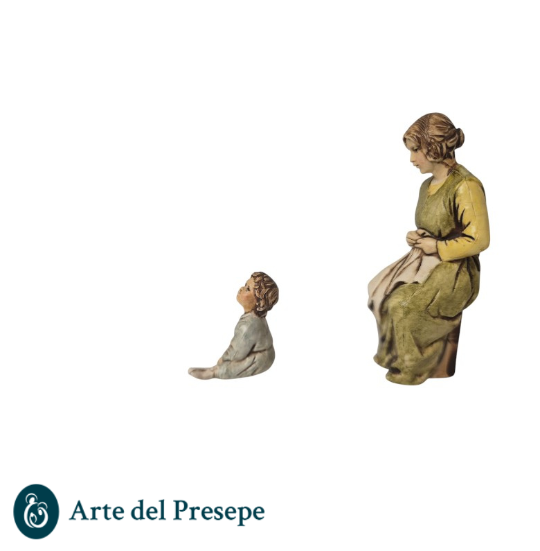 Aggiungi una scena di intima quotidianità al tuo presepe con questa suggestiva raffigurazione della Donna che rammenda. Accompagnata da un bambino seduto ai suoi piedi, questa coppia scolpita dal maestro Martino Landi è ideale per arricchire angoli domestici, mercati o scene di vita di borgo.