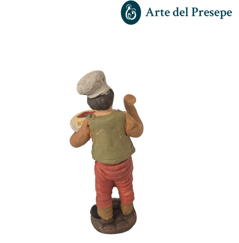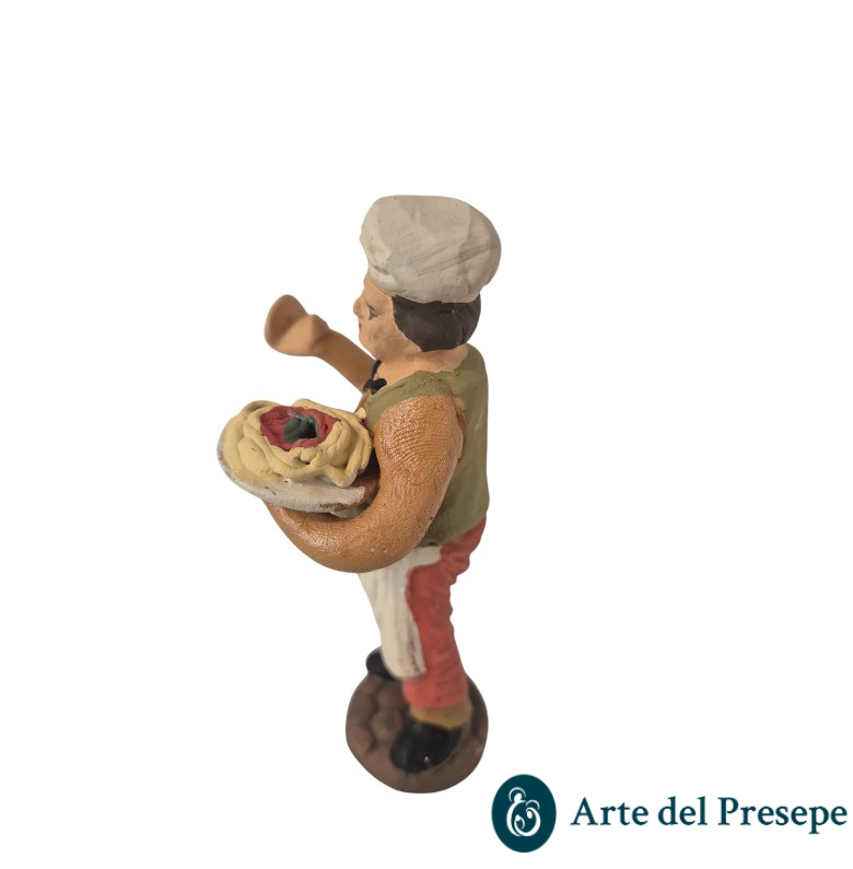 Il personaggio è raffigurato con il classico cappello da chef e un grembiule bianco, mentre sorregge con orgoglio un piatto di spaghetti fumanti. La vivacità dei dettagli e la cura nelle espressioni rendono questa statuina un elemento di grande richiamo visivo e folklore.
